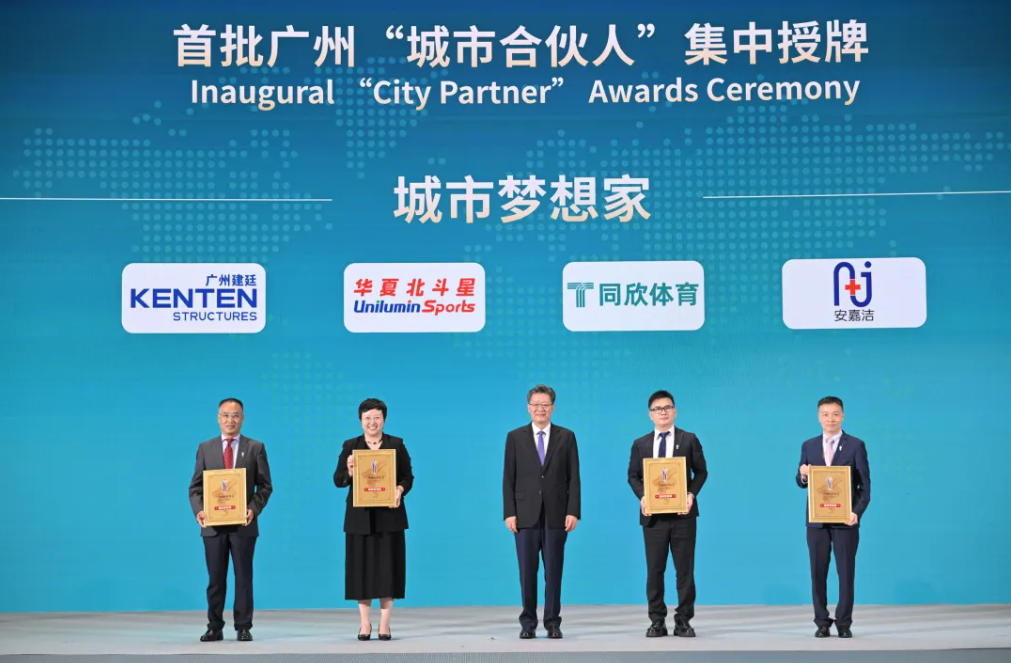 圖丨同欣體育董事長蔡陳敏教授代表公司正式接受廣州“城市合伙人”銘牌(右2)